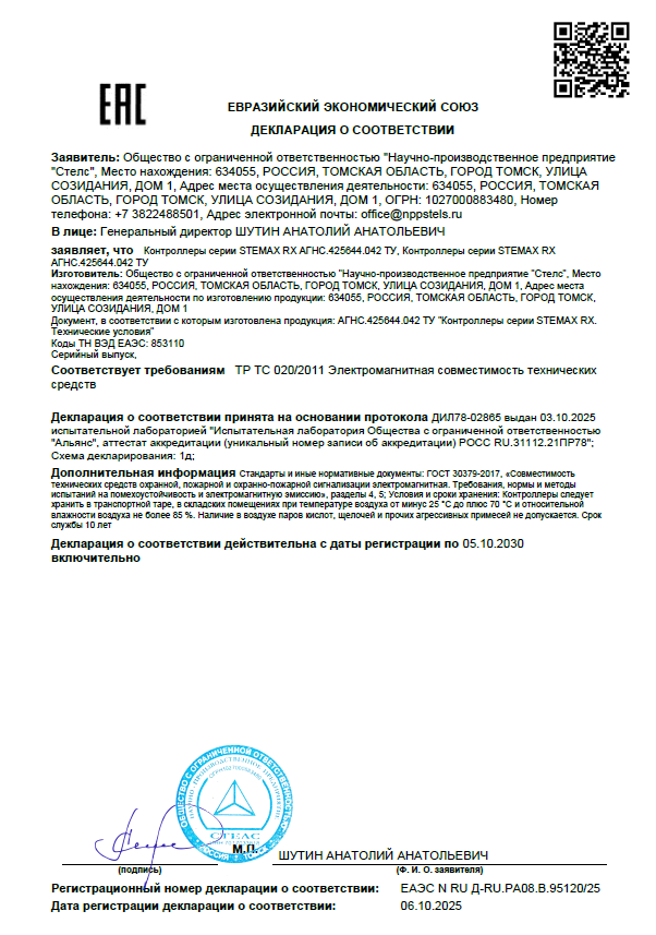 Декларация ЕАЭС N RU Д-RU.РА08.В.95120/25 подтверждает соответствие продукции ТР ТС 020/2011 «Электромагнитная совместимость технических средств».